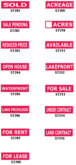 | DESIGN | ST201 – SOLD, ST202 – SALE PENDING, ST203 – REDUCED PRICE, ST204 – OPEN HOUSE, ST205 – WATERFRONT, ST206 – LAKE PRIVILEGE, ST207 – FOR RENT, ST208 – FOR LEASE, ST209 – ACREAGE, ST210 – _ ACRES, ST211 – AVAILABLE, ST212 – LAKEFRONT, ST213 – FOR SALE, ST215 – LAND CONTRACT |