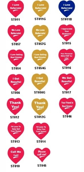 | Design | ST011 – I Love Referrals – Red, ST011B – I Love Referrals – Blue, ST011G – I Love Referrals – Gold, ST012G – Thank You – Gold, ST013 – I'd Love to Help Sell Your Home! – Red, ST014 – I'd Love to Help Find Your Home! – Red, ST016 – Your Personal REALTOR® For Life! – Red, ST017 – We Get Results – Red, ST045 – Please Call Me! – Red, ST054 – I Love Selling Real Estate – Red, ST054G – I Love Selling Real Estate – Gold, ST055 – I'd Love To Be Your Realtor!, ST056 – I Get Results – Red, ST056G – I Get Results – Gold, ST057G – We Love Referrals – Gold |